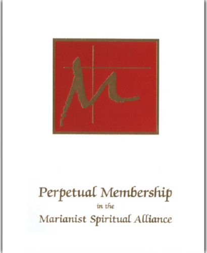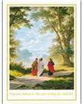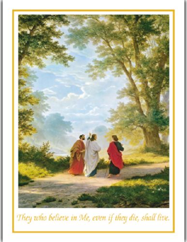 White leatherette padded folder with a gold embossed Marianist cross. Left side features full-color art print of Jesus on the road to Emmaus.
