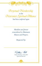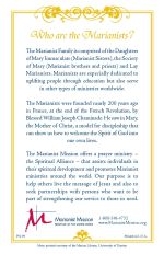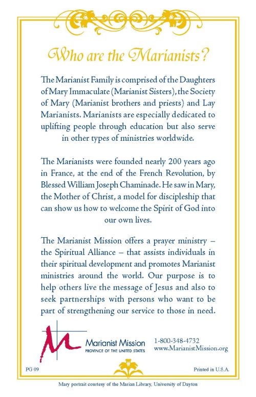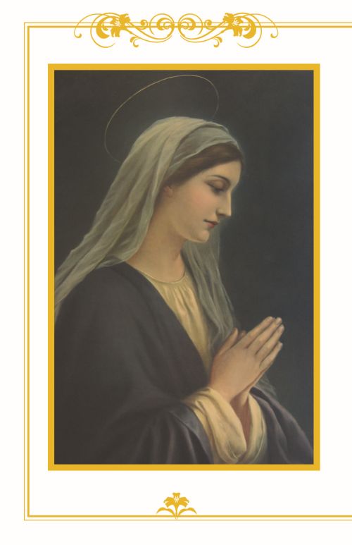 Enrollment page features a picture of the Blessed Mother that seems to capture her prayers for all of God's children. This lovely, old painting is owned by the Marian Library / International Marian Research Institute located on the campus of the University of Dayton in Ohio. The center holds the world's largest collection of material relating to Mary. Library administrators permitted us to use this special image.
