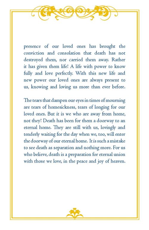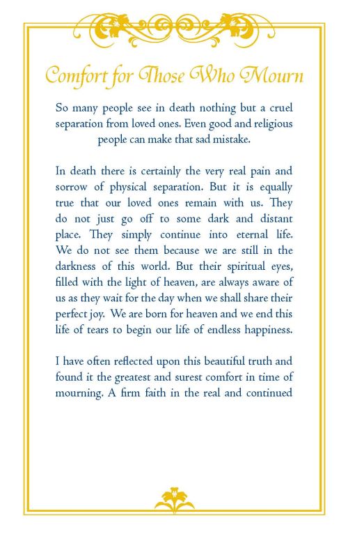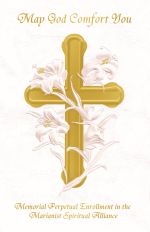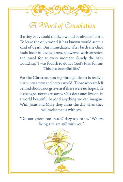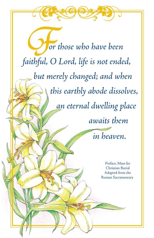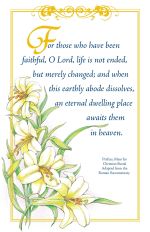 Comforting eight-page booklet with elegant gold cross and embossed white lilies on the cover. The new cross on the cover is called a "budded cross." The three lobes at the end of each section represent the Trinity - Father, Son and Holy Spirit. The lilies on the cover and inside are Madonna Lilies.