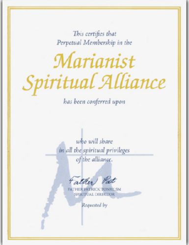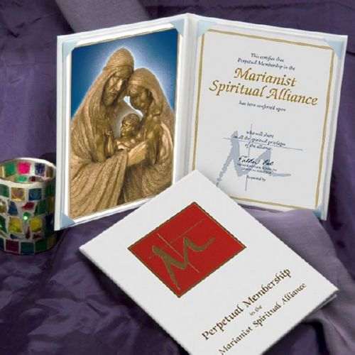 Circle the entire family in prayer! Living and deceased family members all may be remembered by enrolling the family in the Marianist Spiritual Alliance. White leatherette padded folder with a gold embossed Marianist cross. Left inside features full-color print illustration depicting the Holy Family.