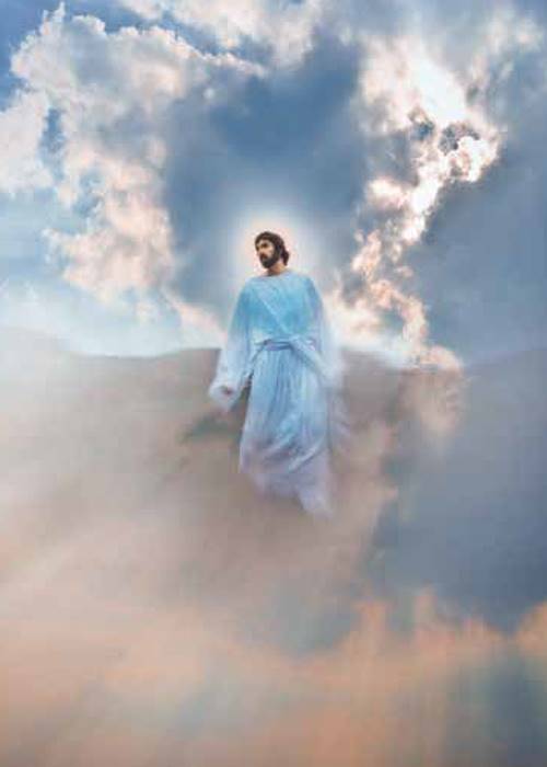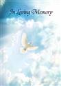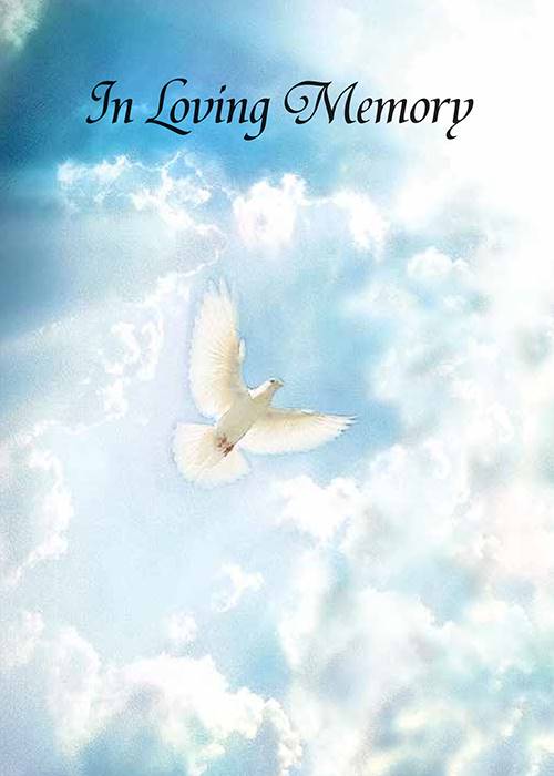 Memorial booklet features a cover image of the Dove of Peace flying through the clouds. Certificate page depicts Jesus among the heavenly clouds.