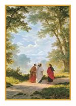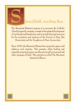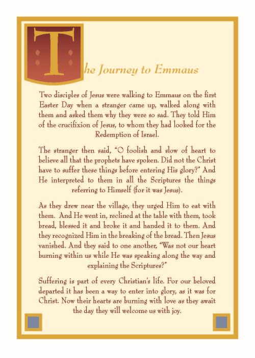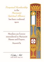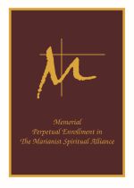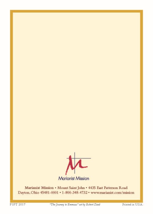Rich maroon cover with gold embossed Marianist Cross. Enrollment page has an illustration of Jesus and two disciples on the road to Emmaus.