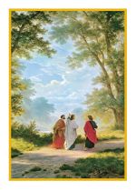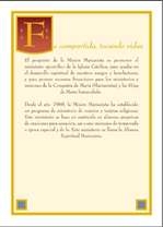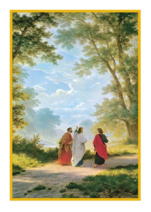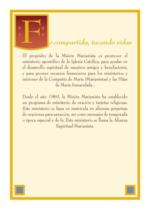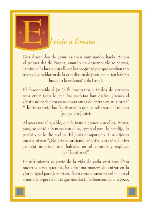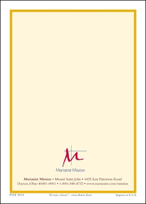 Cubierta en marrón con oro en relieve incluyendo la cruz Marianista. La página de inscripción tiene una ilustración de Jesús y dos discípulos en el camino a Emaús.