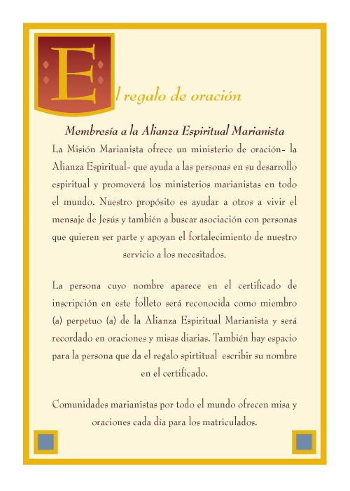 Nuestros folletos se pueden personalizar con letras de oro en la página de certificado para la Alianza Espiritual por $2.00. Los nombres del destinatario (s) o el nombre de la familia y el nombre del remitente están impresos en oro. Si desea estampar los nombres en oro, por favor, llene abajo los nombres apropiados en los espacios provistos.